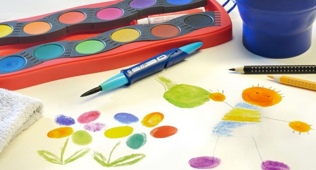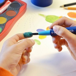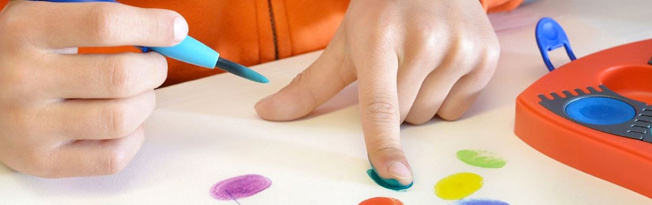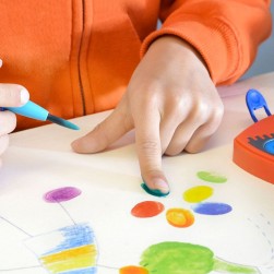 Feel free to use your thumb or other fingers to make the prints too. You'll see how much fun it is to experiment with different shapes and sizes. When you're finished, wash your fingertips thoroughly with soap and water. Or use a baby wipe or cleansing wipe to clean your hands. Please note that paints can stain. Use an underlay and protect your clothes. Spots of paint should be washed off right away with lukewarm water and soap.