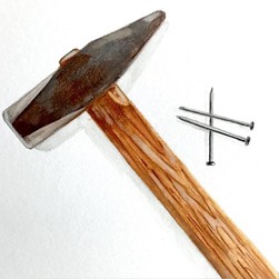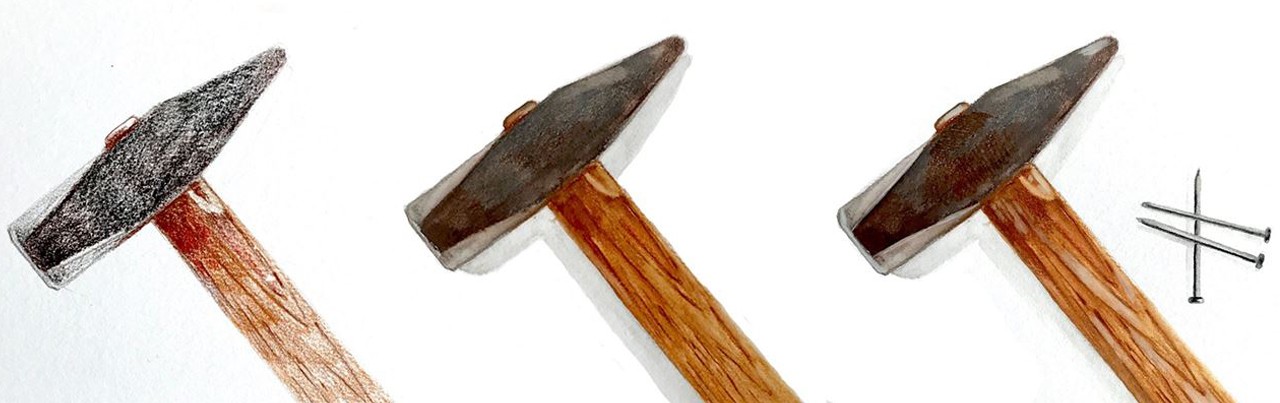 To finish, apply highlights to the hammer head and wooden handle with white 101. Apply white pigment and blend carefully. Work texture into the metal with walnut brown 177. Draw the nail with warm grey V 274 and black 199 and blend with the brush. To finish, apply shadows with warm grey V 274. To do so, either apply a fine layer of paint with the dry watercolour pencil, which you then blend with the water brush or directly remove pigment from the pencil tip with the moistened brush and apply the wet paint to the paper.