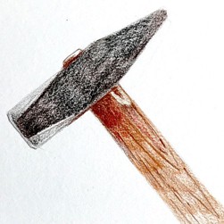 Place ideally one hammer and one nail before you on the table. Real objects make it easier to grasp proportions, materials, shadowing and light points. Alternatively, you can also use a photo. First draw the outline of the hammer on the watercolour paper with warm grey V 274. Then work out the hammer head with black 199, also using walnut brown 177 on the edges. Use warm grey V 274 where the surfaces of the hammer head are bent and the metal reflects the light. Apply walnut brown 177, burnt ochre 187 and Venetian red 190 to the wooden handle. You may press the pencil a bit harder into the paper for the wood grain so that the lines keep better after blending.