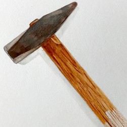 Carefully blend the pigments with the water brush. Make sure not to blur the hammer head and the hammer handle. Trace the grains with the dry watercolour pencil, where necessary.