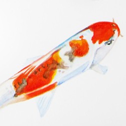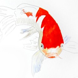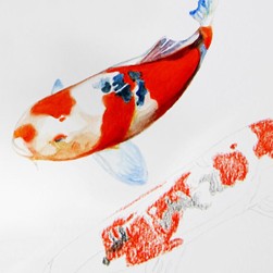 Shade the red areas of the third koi fish the same way as the first and second. Shade the black area. Colour the rest of the koi fish with light ultramarine and warm grey II. Work over the area with a wet paint brush.