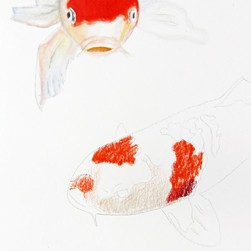 Shade the red parts of the second koi fish the same way as the first fish. The dark red part consists of warm grey II, pale geranium lake and magenta 133. For the area below the eye use warm grey II, cadmium yellow and dark cadmium orange.